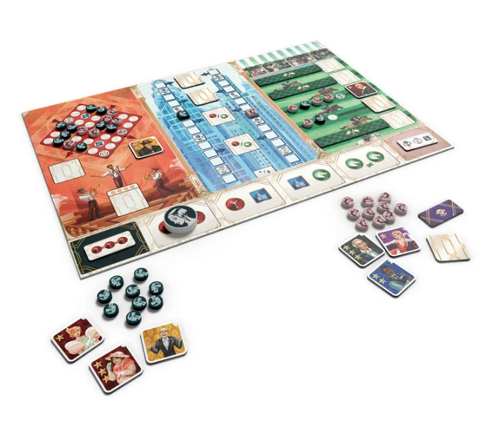 On the board are three locations, each offering different opportunities to get character tiles: the cabaret, the finance center, and the racetrack. To claim these characters, each player will take turns moving the action marker on one of the four action spaces — but not the one just taken by the opponent — then activating it.