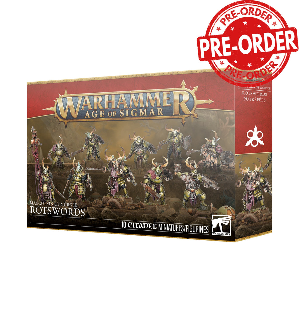 This multipart plastic kit builds 10 Rotswords, heavily armoured mortal infantry for your Maggotkin of Nurgle armies in games of Warhammer Age of Sigmar. Clad in thick plates of rusting metal, they are difficult to take down, making them especially effective at holding objectives. Each Rotsword can be equipped with a pair of deadly, ruined master-crafted weapons or a weapon and a shield. The right-handed weapons and left-handed shields are interchangeable across the miniatures, as are the 12 heads in the kit, making it easy to customise your unit. There are also parts to build an optional champion, musician, and standard bearer with a choice of two banner toppers.