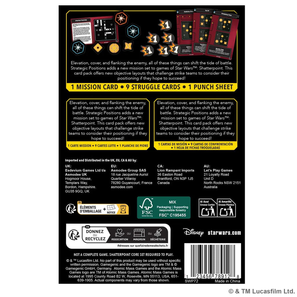 Strategic Positions adds a new mission set of 9 cards (3 Struggle I, II, and III) to games of Star Wars: Shatterpoint. This card pack offers new objective layouts that challenge strike teams to consider their positioning, including rules for Tactical Advantages that allow players to unlock potent bonus abilities for certain units based on the active mission card.