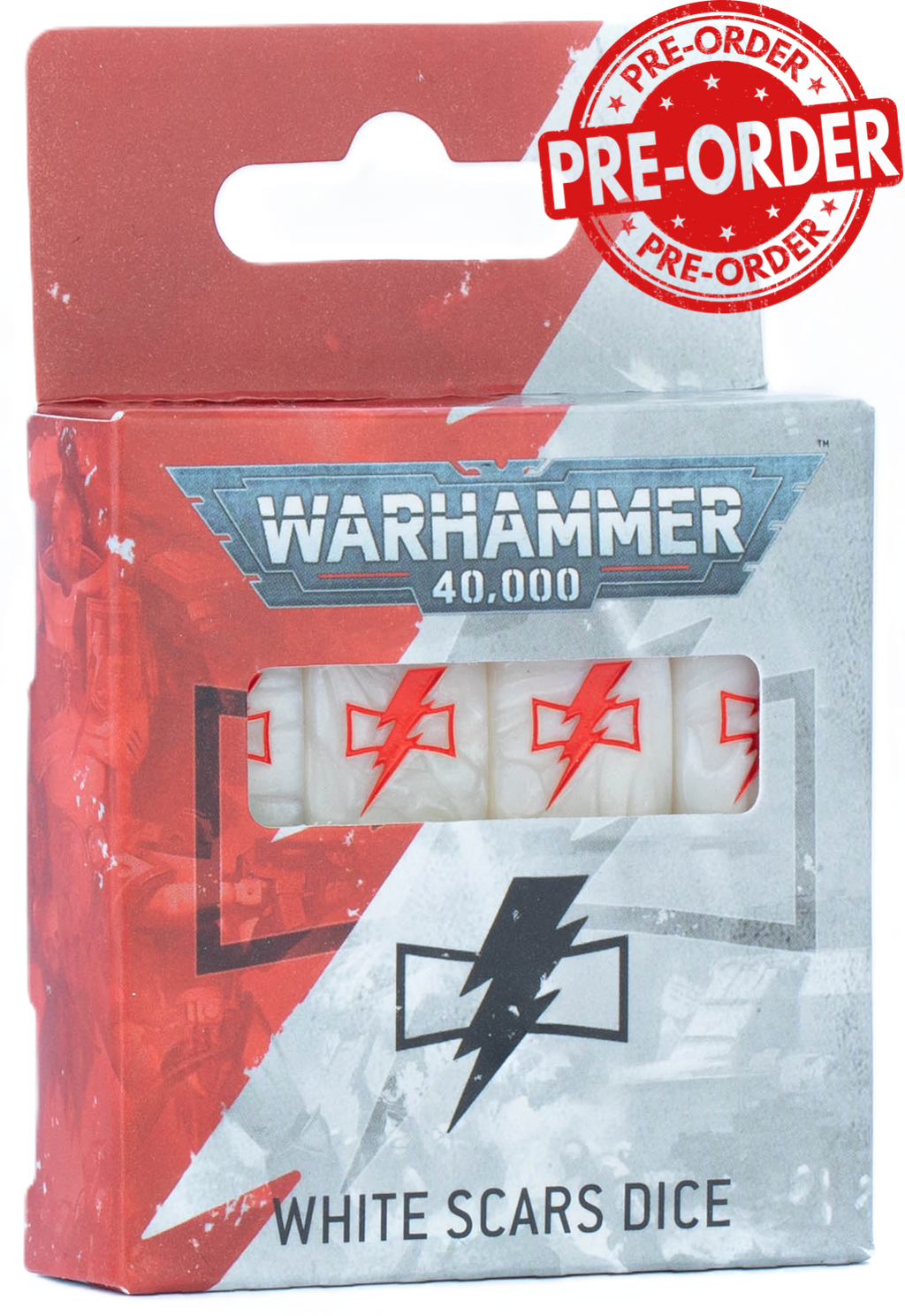 This is a set of 16 six-sided dice with squared edges for use in games of Warhammer 40,000, themed around the White Scars. They are cast in pearlised white acrylic plastic with red ink markings, and measure 16mm along each edge. The 1-5 facings are traditionally pipped, and each '6' face is decorated with the lightning bolt icon of the White Scars.